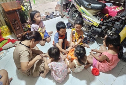 16 giờ tan học, Bảo Anh (8 tuổi) và An Nhiên (6 tuổi) nghỉ ngơi, chơi với em út một chút. Đến 17 giờ, 2 chị em đeo túi, đi bán vé số mưu sinh.