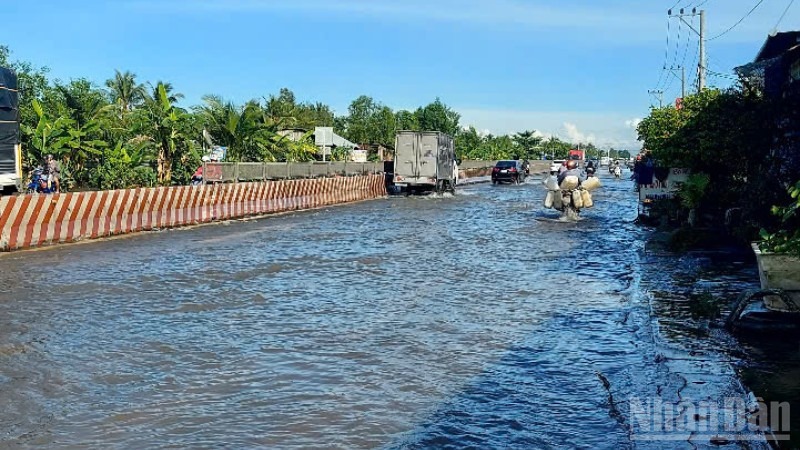 Nước triều dâng sáng 11/10 khiến đoạn Quốc lộ 1 qua thành phố Cần Thơ bị ngập, giao thông gặp khó khăn. Dự báo trong tháng 10 và 11, đỉnh triều có thể tiếp tục vượt báo động III từ 20–30cm.