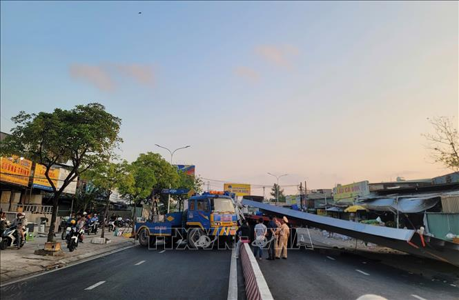 Đến hơn 8 giờ cùng ngày, lực lượng chức năng huy động xe cẩu chuyên dụng để di dời tấm thép và các phương tiện gặp nạn, từng bước giải tỏa ùn tắc.