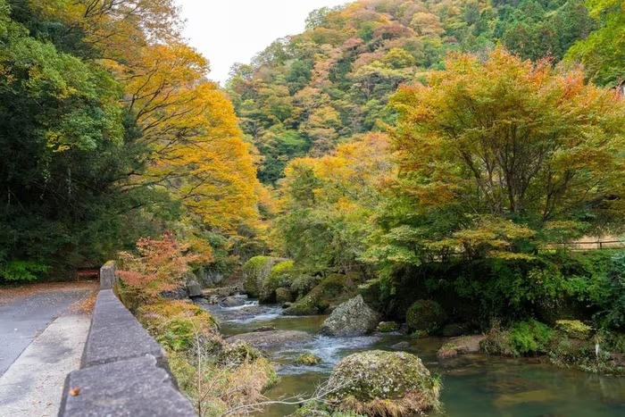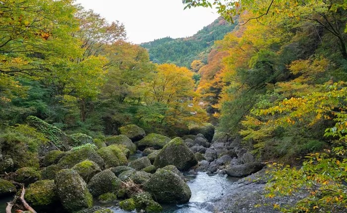 Khung cảnh thiên nhiên dưới chân thác Fukuroda vào mùa Thu. (Ảnh: Xuân Giao/TTXVN) |