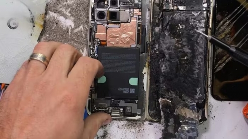 Khi Zack tiếp tục tác động lực vào phần máy đã gãy, viên pin bên trong đột ngột phồng lên, quá nhiệt và bốc khói trắng dày đặc, đủ để kích hoạt hệ thống báo cháy trong phòng. Cuối cùng, chiếc điện thoại đắt tiền chỉ còn là một khối cháy đen trên bàn thử nghiệm.