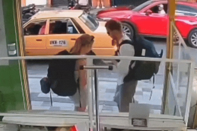 Trong video trích xuất từ camera an ninh đang lan truyền, cặp du khách đang trò chuyện trước lối vào một nơi giống như ngân hàng hoặc điểm đổi tiền ở Colombia. Bất ngờ, một tên côn đồ xuất hiện với vũ khí giống như dao, nhắm đến hai người.