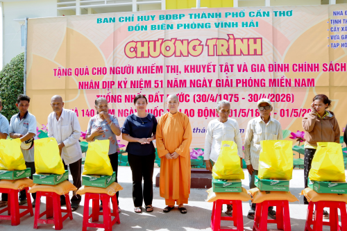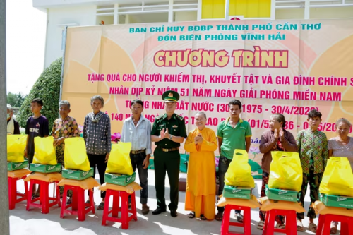 Nhân dịp kỷ niệm 51 năm Ngày Giải phóng miền Nam, thống nhất đất nước (30/4/1975 – 30/4/2026) và 140 năm Ngày Quốc tế Lao động (1/5/1886 -1/5/2026), sáng 21/4, Đồn Biên phòng Vĩnh Hải, Ban chỉ huy Bộ đội Biên phòng TP. Cần Thơ phối hợp với Tịnh Thất Ngọc Sơn (TP. Hồ Chí Minh) cùng các nhà hảo tâm tổ chức chương trình trao tặng quà đến người khiếm thị, người khuyết tật và các gia đình chính sách trên địa bàn xã Vĩnh Hải.