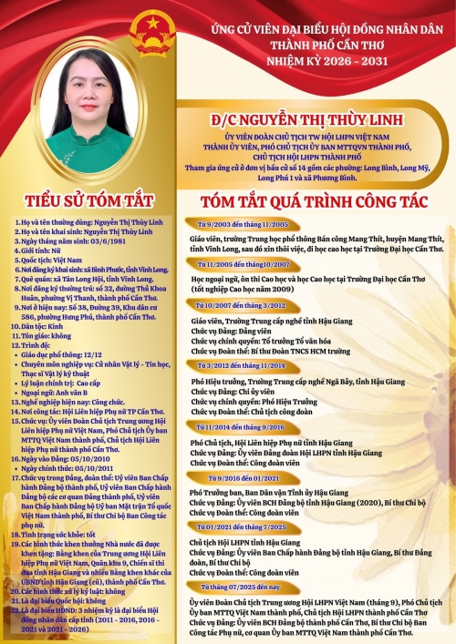 Tiểu sử, quá trình công tác của ứng cử viên Nguyễn Thị Thùy Linh, Ủy viên Đoàn Chủ tịch TƯ Hội LHPN Việt Nam, Thành ủy viên, Phó Chủ tịch Ủy ban MTTQ Việt Nam TP Cần Thơ, Chủ tịch Hội LHPN TP Cần Thơ |