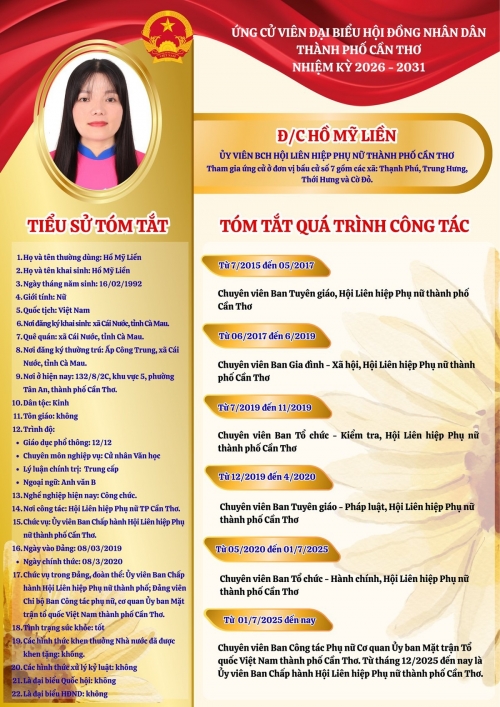 Tiểu sử, quá trình công tác của ứng cử viên Hồ Mỹ Liền, Ủy viên Ban Chấp hành Hội LHPN TP Cần Thơ, chuyên viên Ban Công tác Phụ nữ cơ quan Ủy ban MTTQ Việt Nam thành phố |