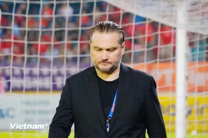 Huấn luyện viên Popov phải nhận thẻ đỏ ở những phút cuối trận. (Ảnh: Việt Anh/Vietnam+) |
