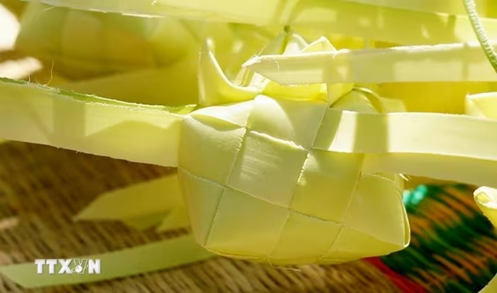 Những chiếc vỏ bánh Kà tum được đan từ lá thốt nốt non rất cầu kỳ, tạo điểm nhấn cho chiếc bánh truyền thống của người Khmer vùng Bảy Núi An Giang. (Ảnh: Công Mạo/TTXVN) |