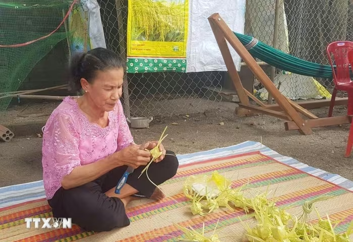 Nghệ nhân Neáng Phương tỉ mỉ đan từng chiếc vỏ bánh Kà tum, thể hiện sự khéo léo từ đôi bàn tay của người phụ nữ dân tộc Khmer. (Ảnh: Công Mạo/TTXVN) |