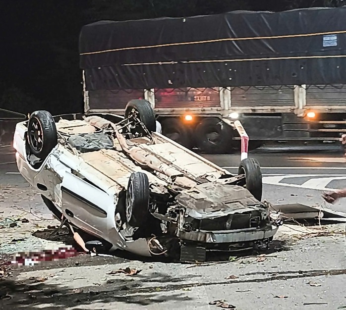 Vụ tai nạn khiến anh L.V.D tử vong, xe ô tô bị biến dạng, lật ngửa.